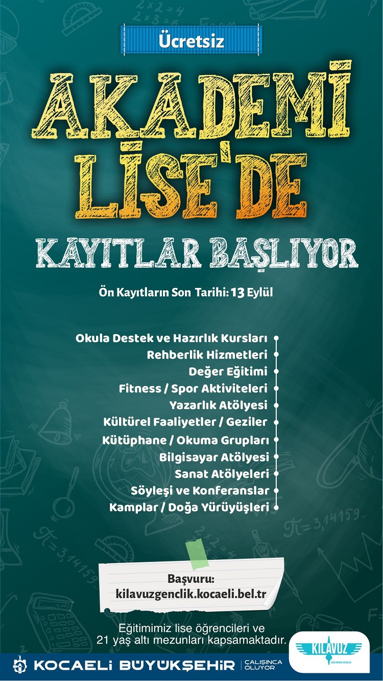 Klavuz Gençlik Akademi High School continues its activities in 9 districts and 11 centers. There are two Academy High Schools each in Izmit and Gebze, and one Academy High School each in Kandıra, Kartepe, Derince, Körfez, Gölcük, Karamürsel and Dilovası districts. Please choose the Academy High School you prefer carefully.